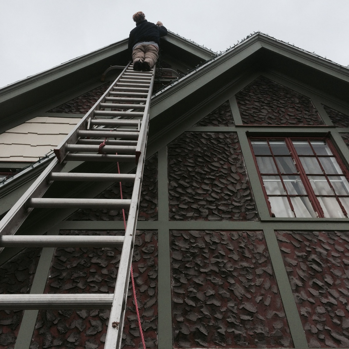 As many of you well know, one of my favorite features of our house is the unique triple gable. We bought enough lights to light the christmas tree inside and hopefully line all of the gables on the outside. One of our neighbors let us borrow their giant extension ladder(should have thought about that for stripping the paint this summer), and we were in business. Of course, the higher and higher I got the more Kit did not want to watch…but she did snap this great shot at I was placing lights at the peak.