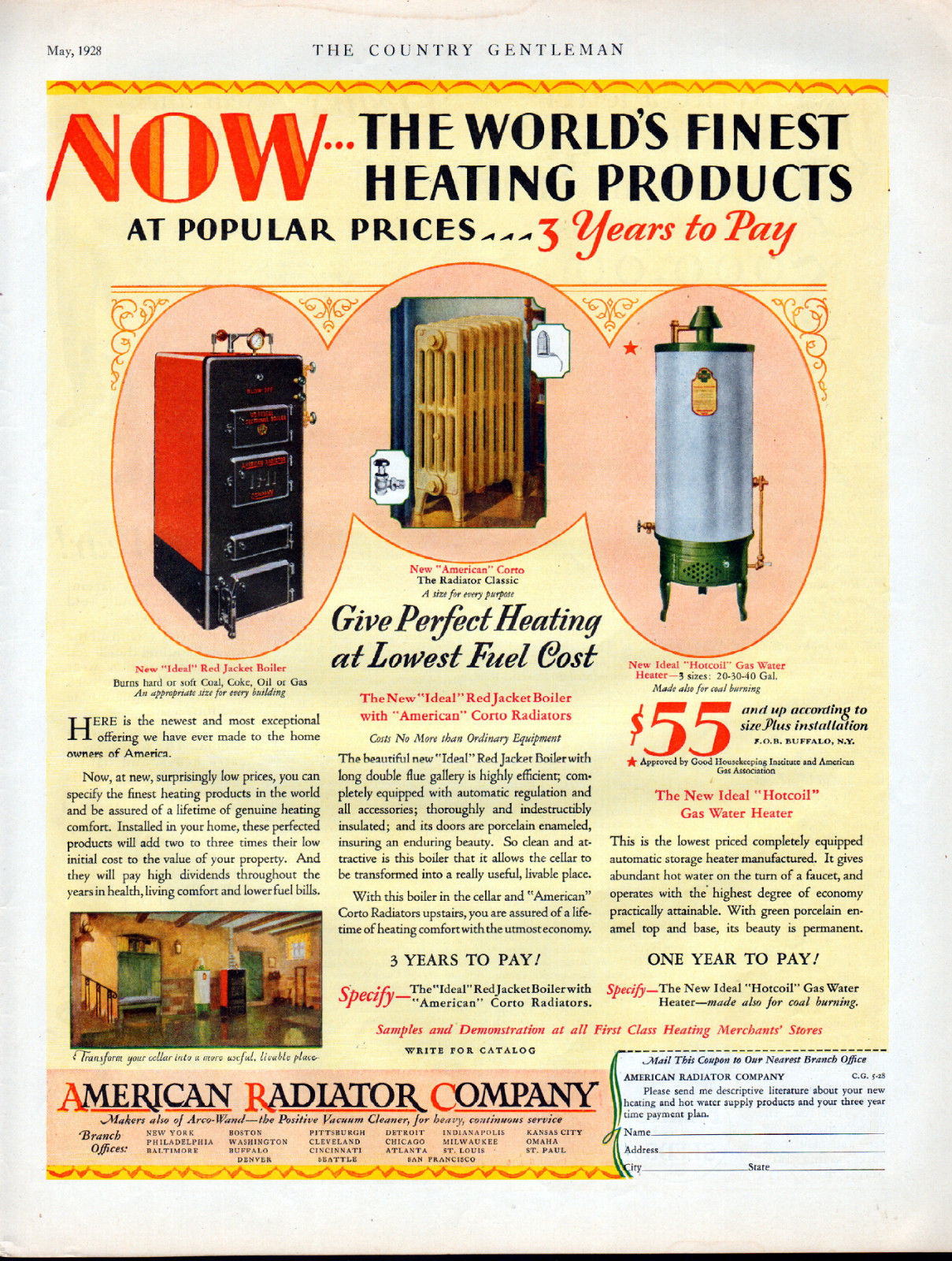 Our house was originally outfitted with a cutting edge American Radiator Company steam heating system comprising of an Ideal Redflash Boiler and Corto radiators. I have a strong affection for Corto radiators, whose timeless design conceived by French industrial designer Louis Courtot in 1917 strike a delicate balance between efficient function (with their vastly expanded surface area, key to convection) and beautifully refined proportions. American Radiator even went to the length of producing an elaborately illustrated pamphlet celebrating the Corto, seen here. The Ideal Hotcoil water heater was also installed to complete the American Radiator Company trio. Not surprisingly the only portion of this system that survived the decades were the Corto radiators, however I’ve seen more than one person online proudly sharing photographs of their still functioning and beautiful Redflash boiler….sigh if only.